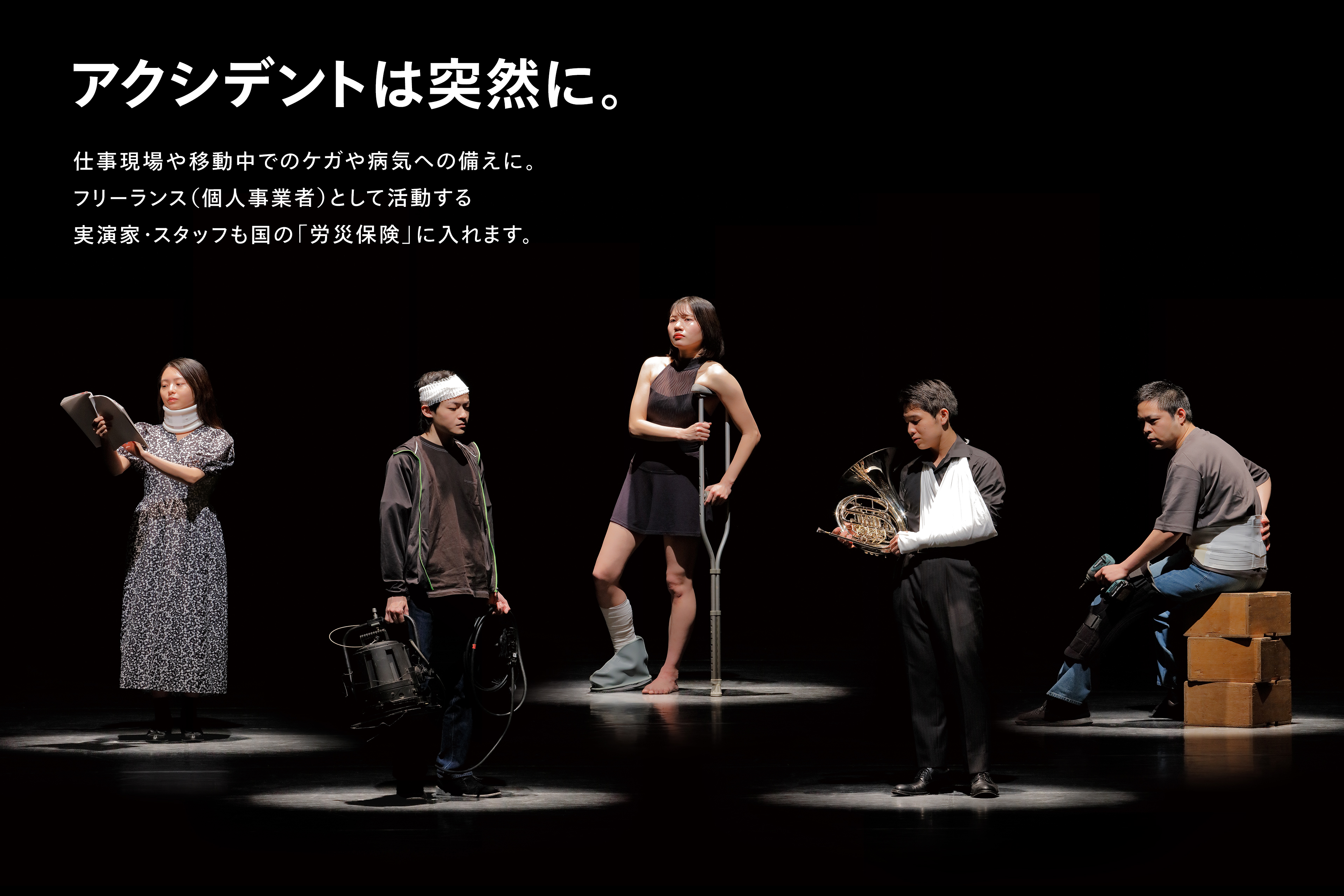 演じる、踊る、歌う、演奏するなどの身体的な表現を行う実演家や、公演、撮影、収録などで危険な作業も多いスタッフは、現場でケガ等をするリスクが高い上に、万が一、身体が思うように動かせなくなったら、その活動を続けられなくなってしまいます。身体が資本の実演芸術活動を長く続けていくために、労災保険特別加入を活用して、万が一に備えていただきたいと思います。